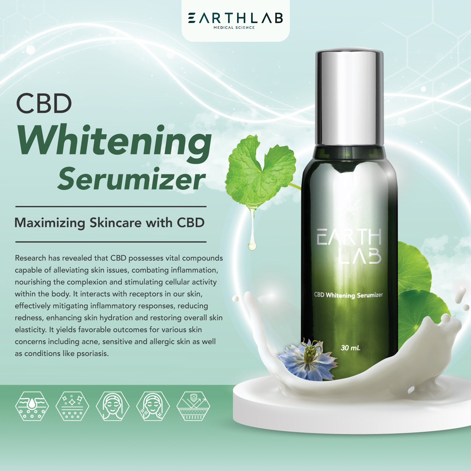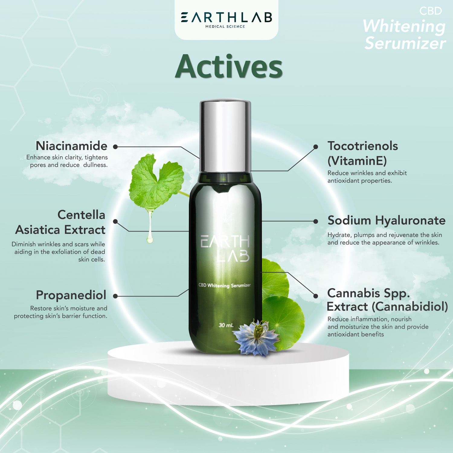 EARTHLAB WHITENING SERUMIZER: A lightweight serum enriched with natural ingredients such as CBD, Centella Asiatica Extract, and antioxidants to reduce wrinkles, brighten dull skin, deeply hydrate, and protect the skin for a healthier appearance.
