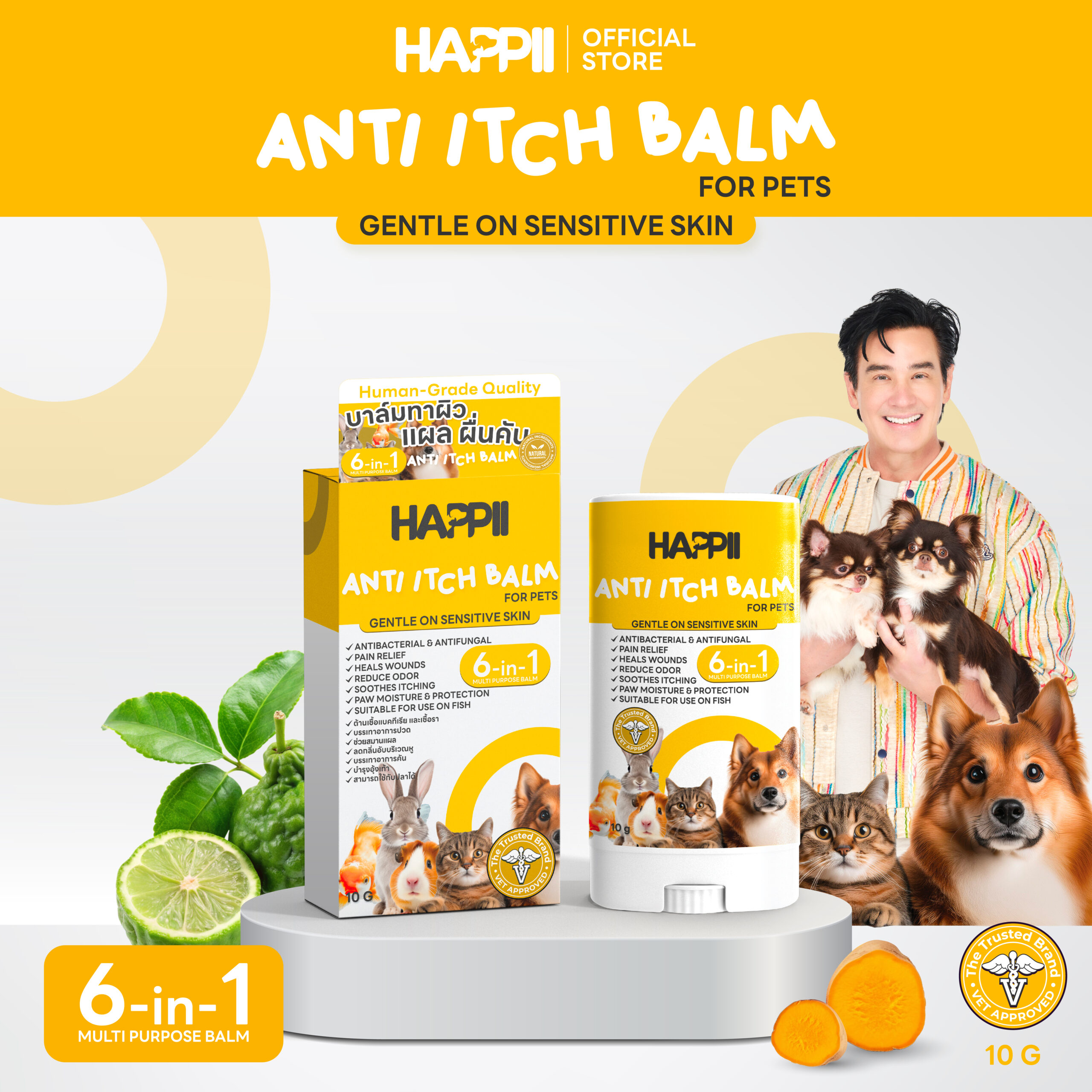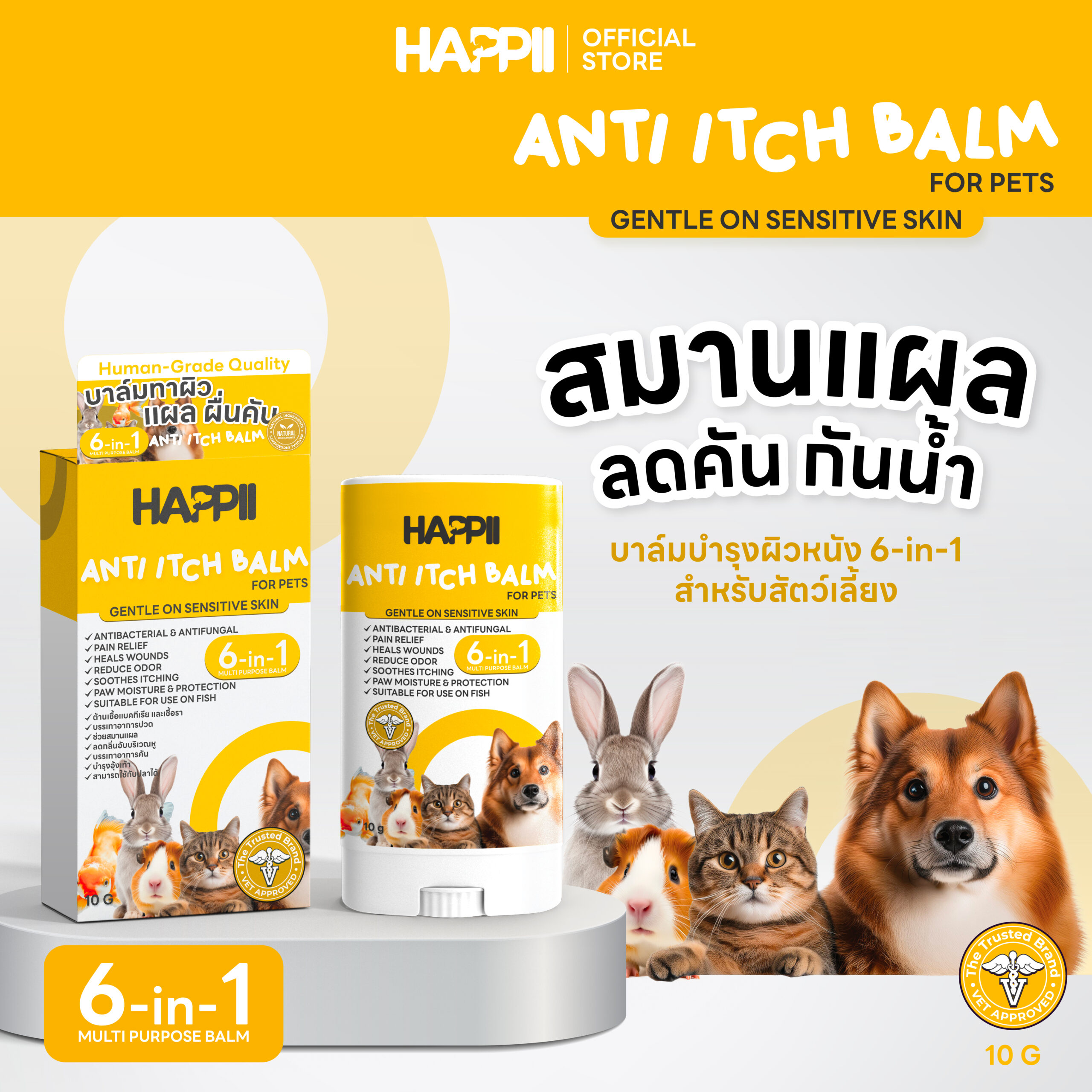 HAPPII ANTI-ITCH BALM FOR PETS: A gentle skin care balm specially formulated for pets with sensitive skin. It helps heal wounds, reduce itching, and protect the skin from irritation. The balm also deeply moisturizes the skin, making it suitable for dogs, cats, and small pets like rabbits or hamsters.